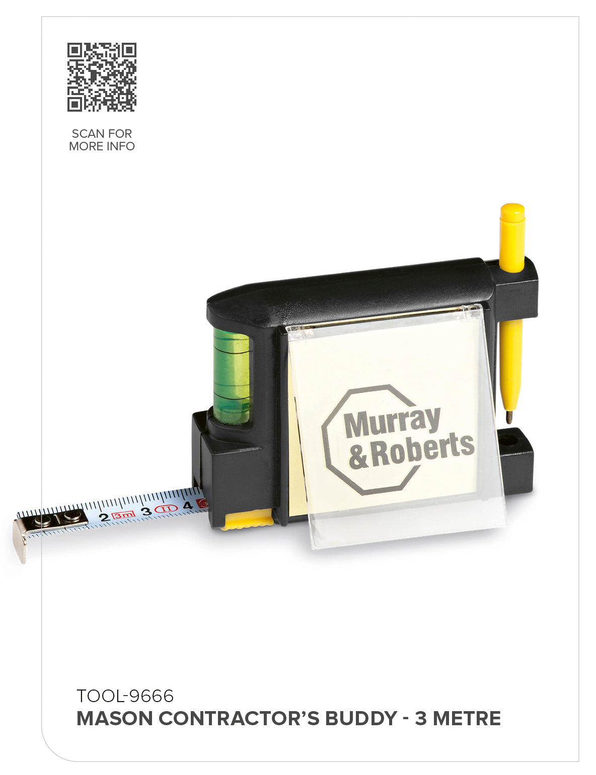 A functional promotional item ideal for the construction industry. Includes ,3m measuring tape, spirit level ,pen , memo pad ,belt clip at back ( not shown )