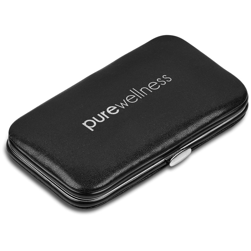 A set of quality nail care instruments in a compact case, ideal for travel.