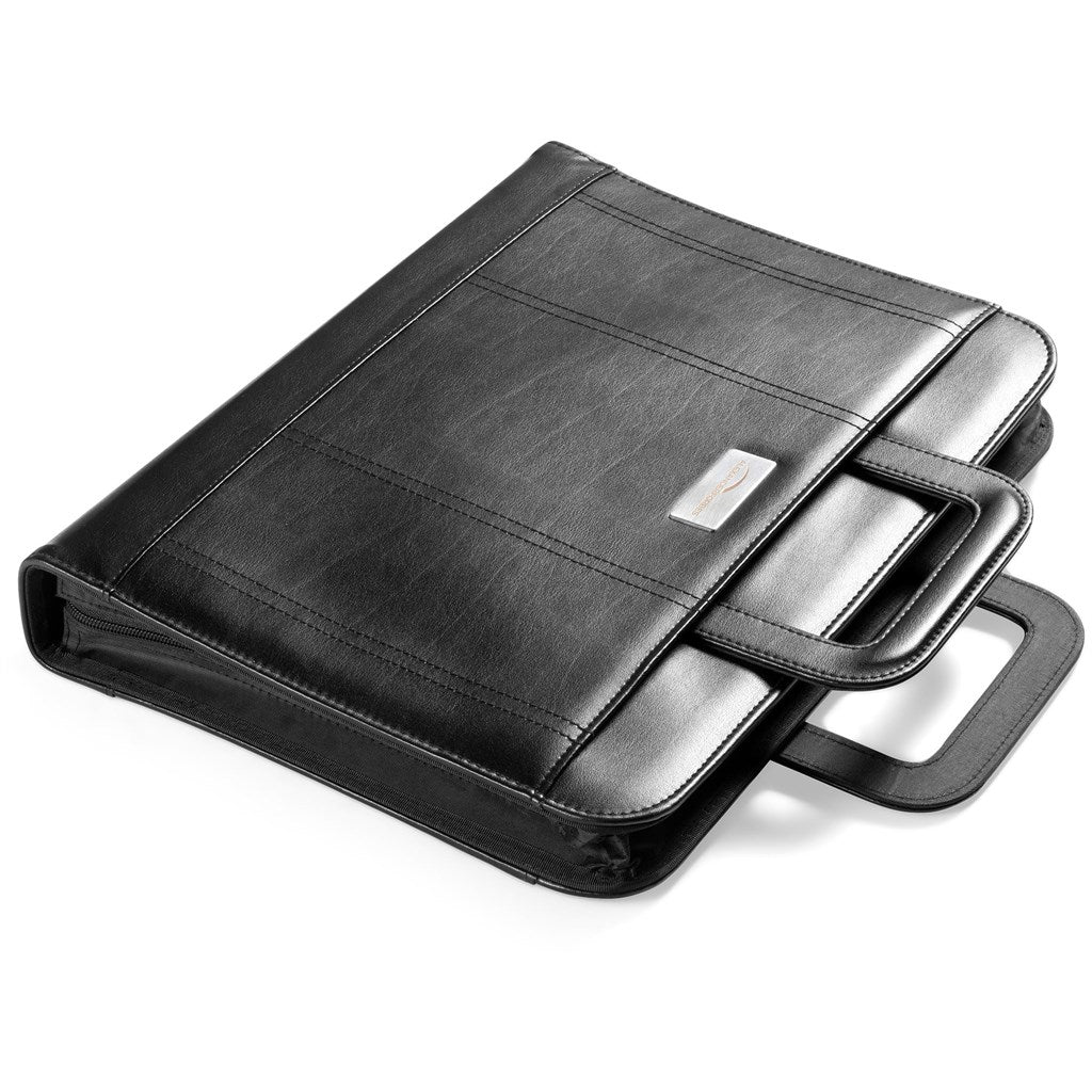 Made from a smooth black PU, with black stitching design, this folder has drop-down handles and a removable 2-ring binder fitting. It features a metal plate on the front cover for laser engraving of your logo.
