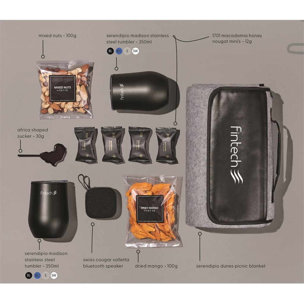 The Yatta range of hampers is expertly crafted to provide a delightful experience with a curated selection of premium items and edible treats. Elegantly presented in a Yatta drawstring bag, this hamper is further encased in a durable Dark Grey RPET felt gift bag.